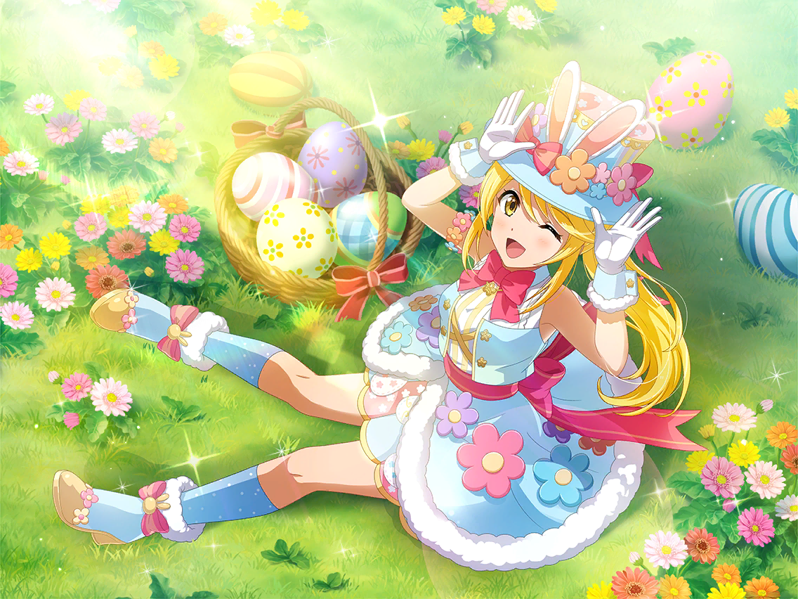 | home [토끼루루야 깡총!] 라라핀은 대단해! 대단하지~! 달걀 모양은 별이나 달 같은, 반짝반짝 빛나는 걸 엄~청 많이 그려야지~! 토끼 의상을 입은 채로 직접 만든 과자를 전달할까? 모처럼의 부활절인걸♪ 프론티어는 정말, 즐거운 학교네~ 다음엔 어떤 이벤트가 있을까♪ 시즈하, 굉장히 심각한 얼굴로 숨기고 있어. 미소라와 츠카사가 찾아낼 수 있을까? 놀기만 한 게 아니라, 제대로 연기 공부도 하고 있어! 어이쿠! 모자가 벗겨질 뻔했어...... 조금 너무 들떴나 봐. 일부러 알기 쉬운 곳에 숨겨볼까! 등잔 밑이 어둡다고들 하잖아? 네 전용 달걀을 준비했어! 시즈하가 숨겼으니까, 힘내서 찾아봐! 파이팅! theater 의상을 입으면 기뻐서 입가에 미소가 번져! 어떻게 하면 모두를 즐겁게 하는 연기를 할 수 있을까~? 토끼 역할의 무대는 없을까? 토끼와 거북이 같은? 달걀을 숨기는 것뿐만 아니라 다른 놀이 방법도 있구나. 흥이 오르면 나도 모르게 힘이 들어가 버려. 우리들의 다음 무대도 보러 와주면 좋겠어! 모두와 무대에 서고 싶어서 근질근질 거려~! 토끼 아루루가 행복을 전해줄게! |