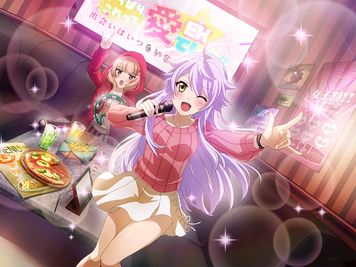 「여러분~! 응원 고마워요~!」 이치에는 뼛속부터 아이돌이다. 남들에게 주목을 받으며 귀엽게 행동하는 것이 특기. 오늘도 유유코와 함께 노래방에서 아이돌 노래를 열창 중. |