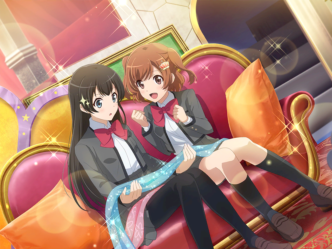 「이것 봐, 이거! 요전에 본 무대에서 공주님이 두른 거랑 똑같아!」 소도구를 찾으러 왔다가 스카프를 발견한 카렌과 히카리. 뮤지컬 「알라딘과 마법 램프」를 떠올리자 마음은 벌써 무대 위에 올라가 있다. |