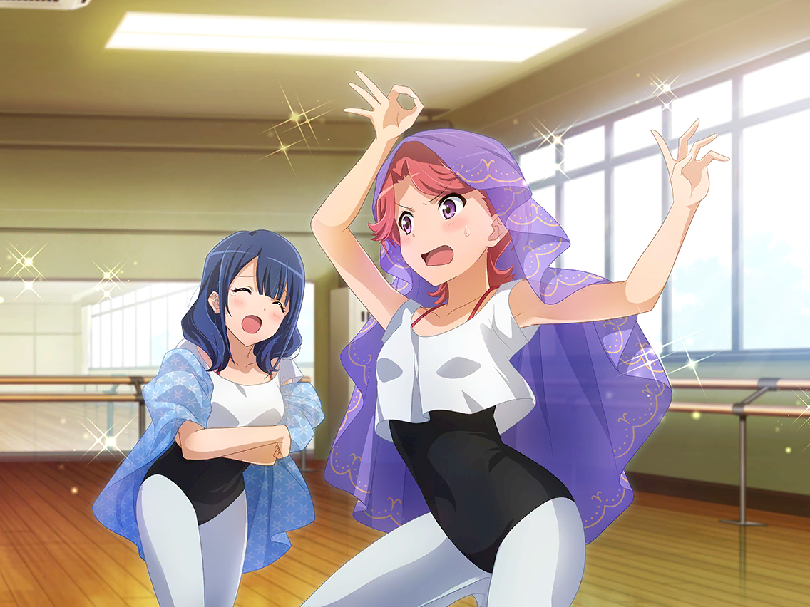 「손끝을 비틀어서... 어때, 카오루코?」 뮤지컬 [알라딘과 마법 램프]를 떠올리며 그 댄스를 재현해 보는 후타바와 카오루코. 「멋지게 잘 추네요, 코믹 댄스.」 「코믹 댄스 아니거든!」 |