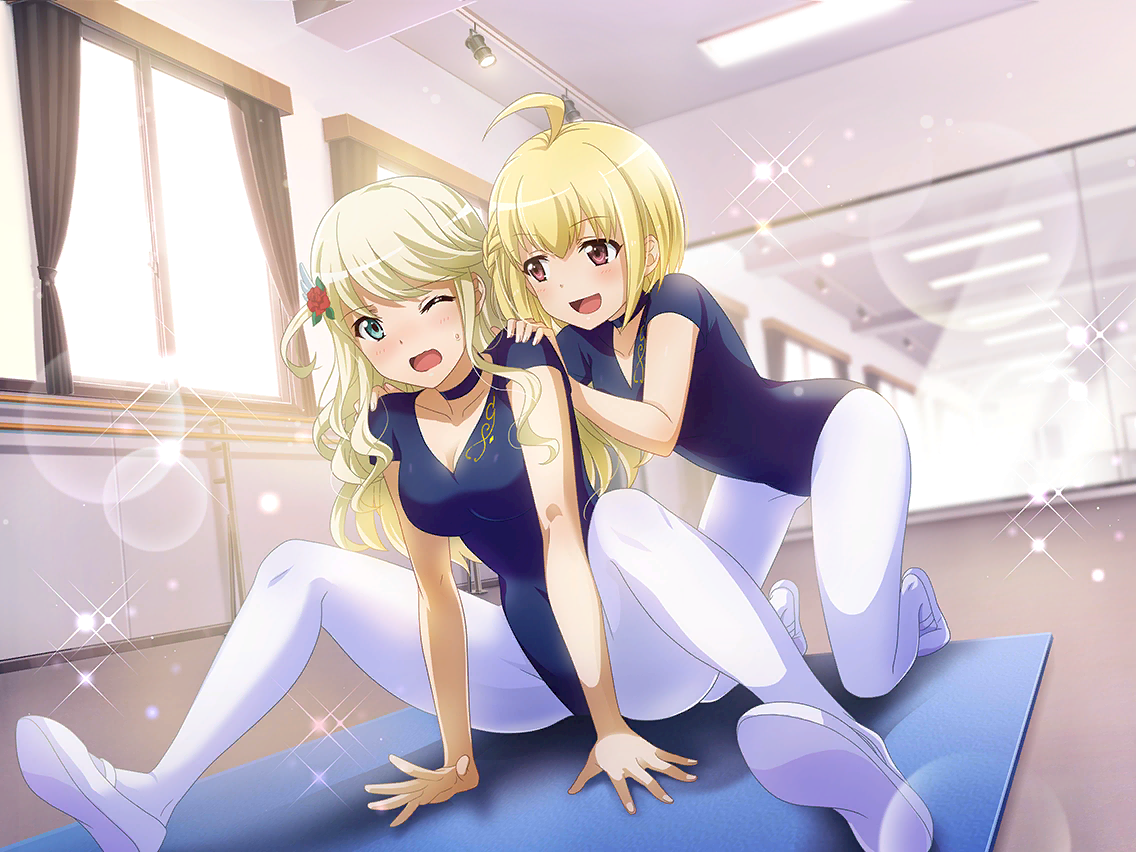 「으윽, 미치루 선배. 더 이상은 무리예요!」 레슨 전 스트레칭은 매우 중요하다. 몸이 유연하지 않은 시오리의 등을 밀어 스트레칭을 돕는 미치루. 살짝 즐거워 보이는 것은 분명 기분 탓이다. 울상을 지은 시오리를 잘 격려해 주기를. |