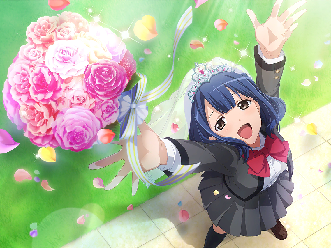 웨딩 베일을 걸치고 소도구인 부케를 손에 들고 오늘의 카오루코는 신부 기분. [제 행복 모두에게 나눠줄게요... 아니, 역시 이 부케도 제 거예요!] [어이! 행복을 독점하지 마~!] |