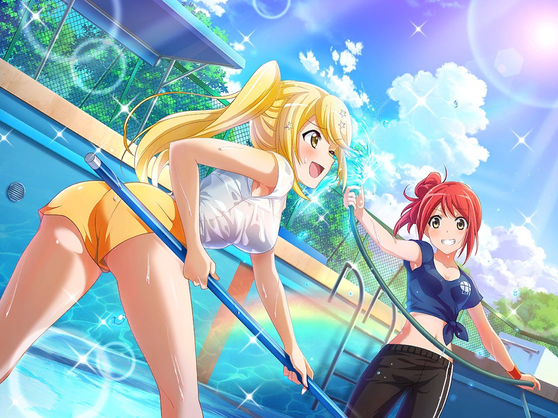 「왠지 기분 좋다!」 아루루가 재밌을 것 같다며 자원한 방과 후 수영장 청소. 친구 혼자서는 힘들겠다고 생각한 미소라가 돕기로 했다. 그런데 막상 해 보니 물이 시원하고 기분 좋아 둘 다 왁자지껄 떠들며 청소를 했다. |