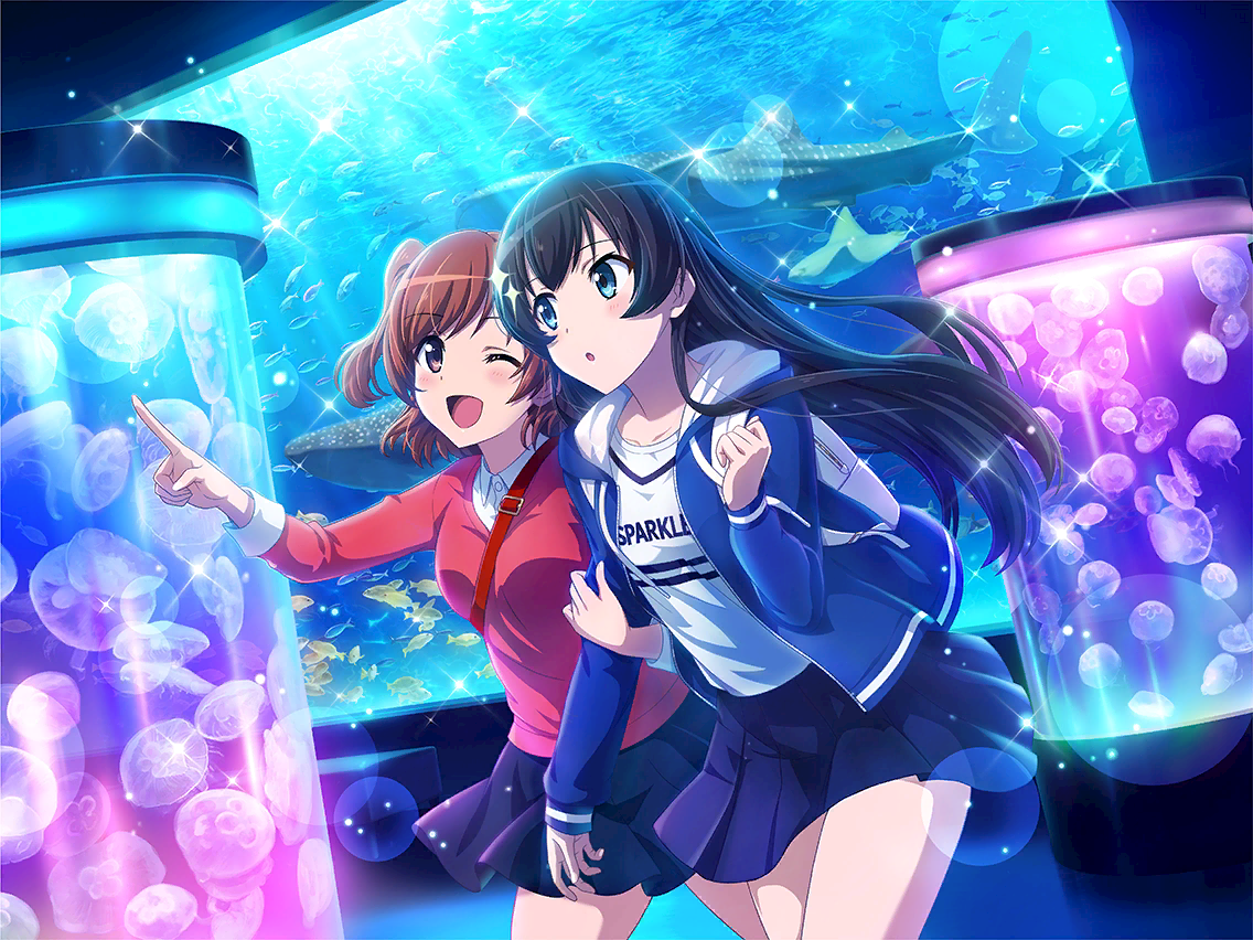 「히카리, 여기 좀 봐! 이 해파리는 거꾸로야!」 연습의 피로를 달래러 수족관을 찾은 두 사람. 해파리처럼 시간은 느릿느릿 흐른다. 히카리의 해파리 게이지도 완벽하게 충전 완료. |