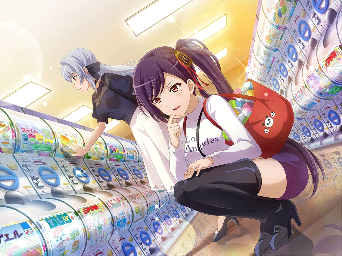 「다음에는 꼭 레어한 걸 뽑을 거예요.」 캡슐 토이에 푹 빠진 메이팡. 가방은 이미 캡슐로 터질 듯했다. 그 뒤에서 어이없어 하는 아키라... 그런데 그 사이 마음에 드는 캡슐 토이를 찾은 모양이다. 레어 캡슐에 정신이 팔린 나머지 진정한 레어 장면을 놓치고 있어, 메이팡! |