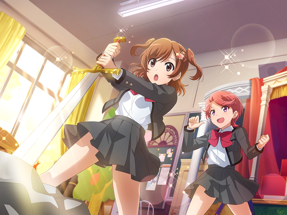 「저기 봐, 카렌! 검이 빛나고 있어!」 후타바와 카렌이 발견한 것은 아침 햇살에 빛나는 [엑스칼리버] 대도구. 「이 검을 뽑는다면 내가 주인공이야!」 「힘내라, 카렌 아서!」 마음대로 뽑았다가는 B반에게 혼날 텐데? |