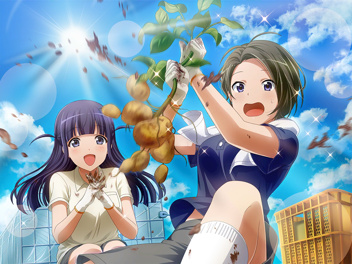 마히루의 고향집 [츠유자키 농장]에 농업 체험을 하러 방문한 마히루 일행. [자, 좀 더 발을 안정시켜봐...!] [응, 알겠어! ...뽑혔어!!] 마히루의 조언으로 훌륭하게 잘 자란 감자캐기에 성공한 스즈. 오늘 저녁은 갓 수확한 마히루 감자로 결정! |