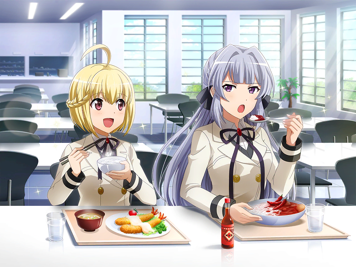 [아키라, 오늘 카레 평소랑 냄새가 다르네.] [역시 미치루야. 오늘은 신작 카레용 특제 칠리소스를 사용했어.] 보기만 해도 기침이 날 것 같은 아주 매운 카레를 앞에 두고 태연하게 점심 식사를 즐기는 아키라와 미치루. 오후 레슨에 대비해 잠깐 동안의 휴식을 만끽하고 있다. |